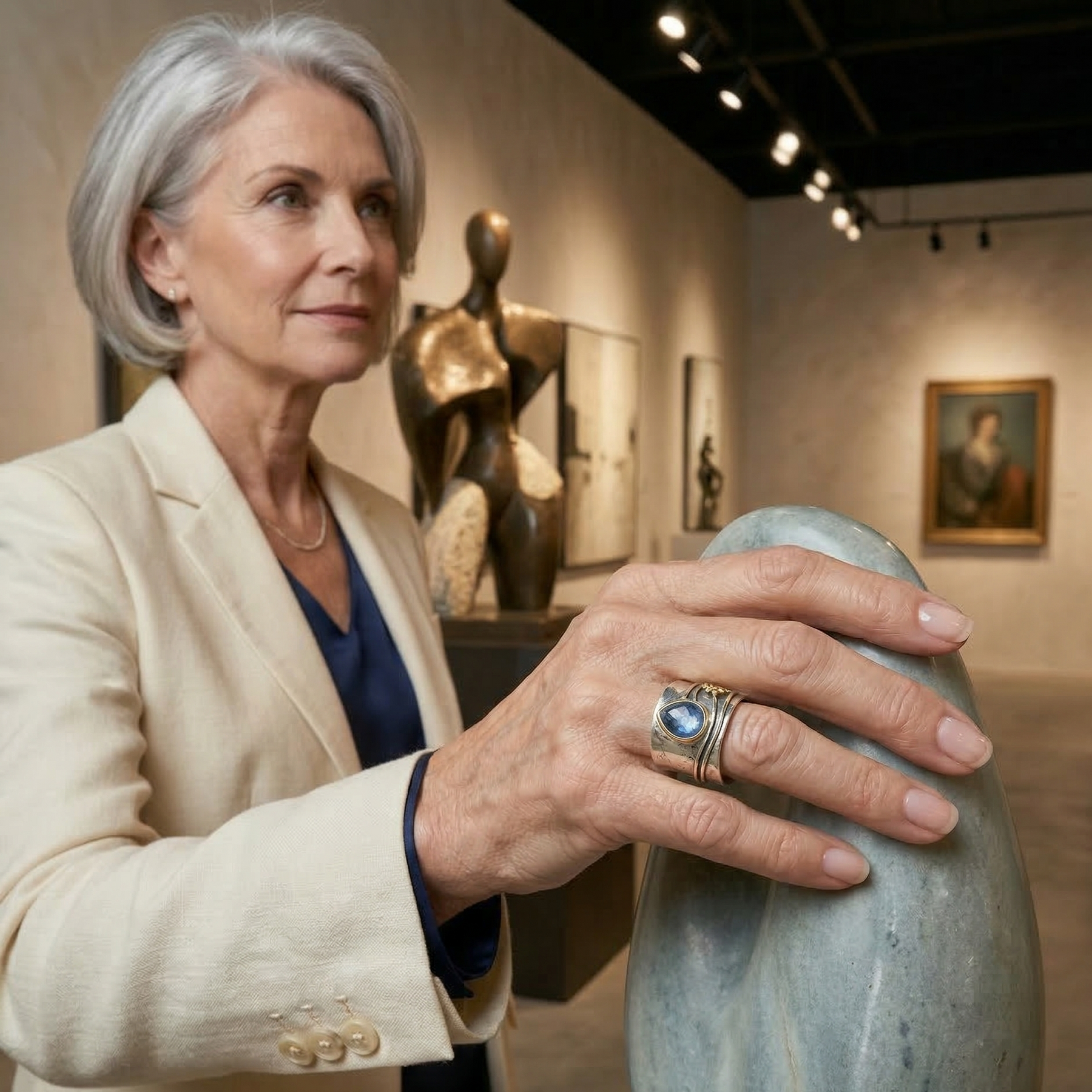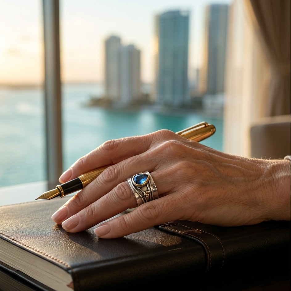 Un anillo artesanal de estilo rústico. La pieza presenta una banda ancha con un acabado texturizado y detalles en relieve que le dan un aspecto orgánico y único. En el centro destaca una piedra preciosa de color azul profundo, con forma de gota o lágrima. A un lado del anillo se observan pequeños detalles esféricos que añaden un toque decorativo y artístico. El diseño combina elementos modernos y naturales, transmitiendo una sensación de pieza hecha a mano, sofisticada y original.