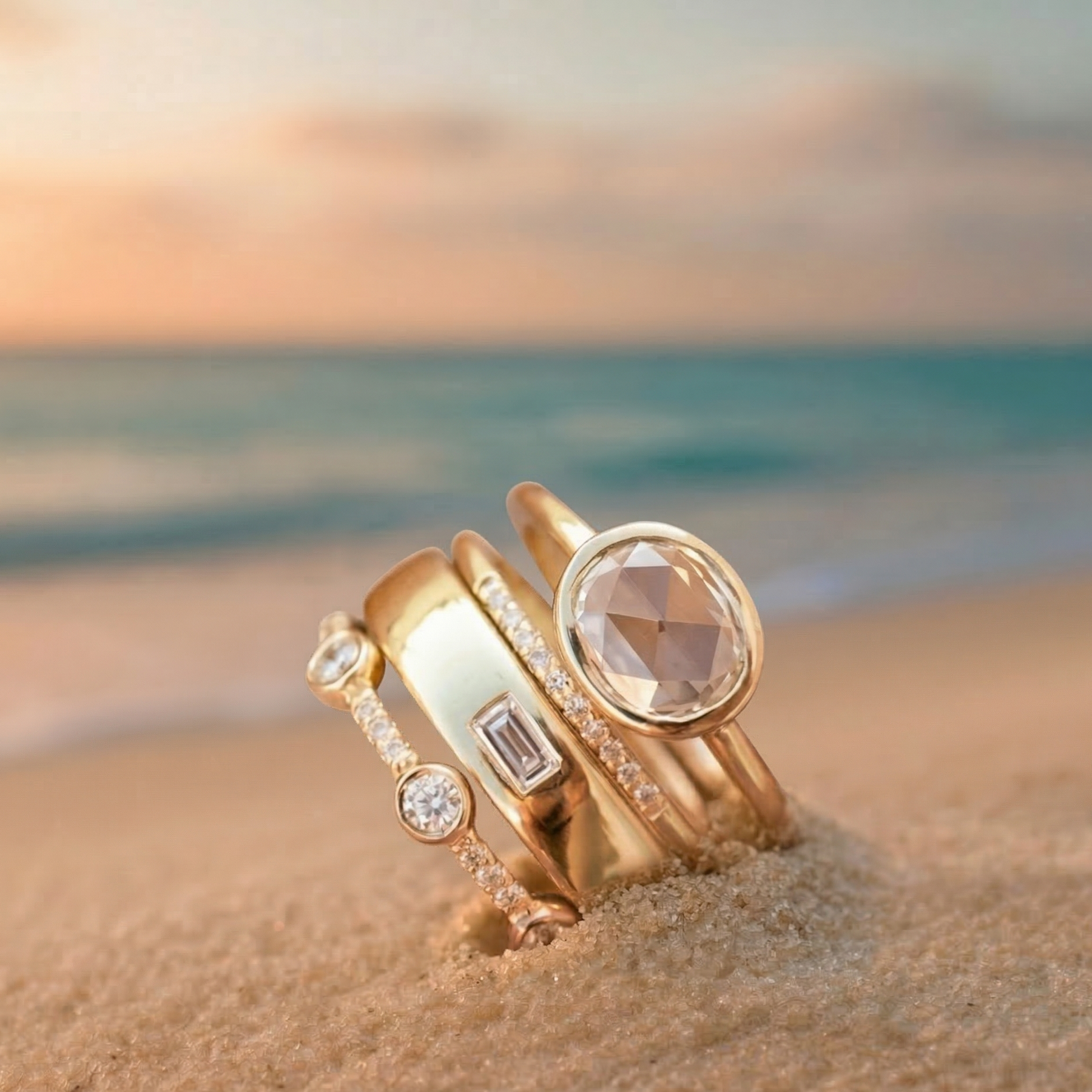 La combinación de diferentes diseños y tamaños crea un look minimalista pero muy refinado, ideal para un estilo moderno y femenino. El brillo del