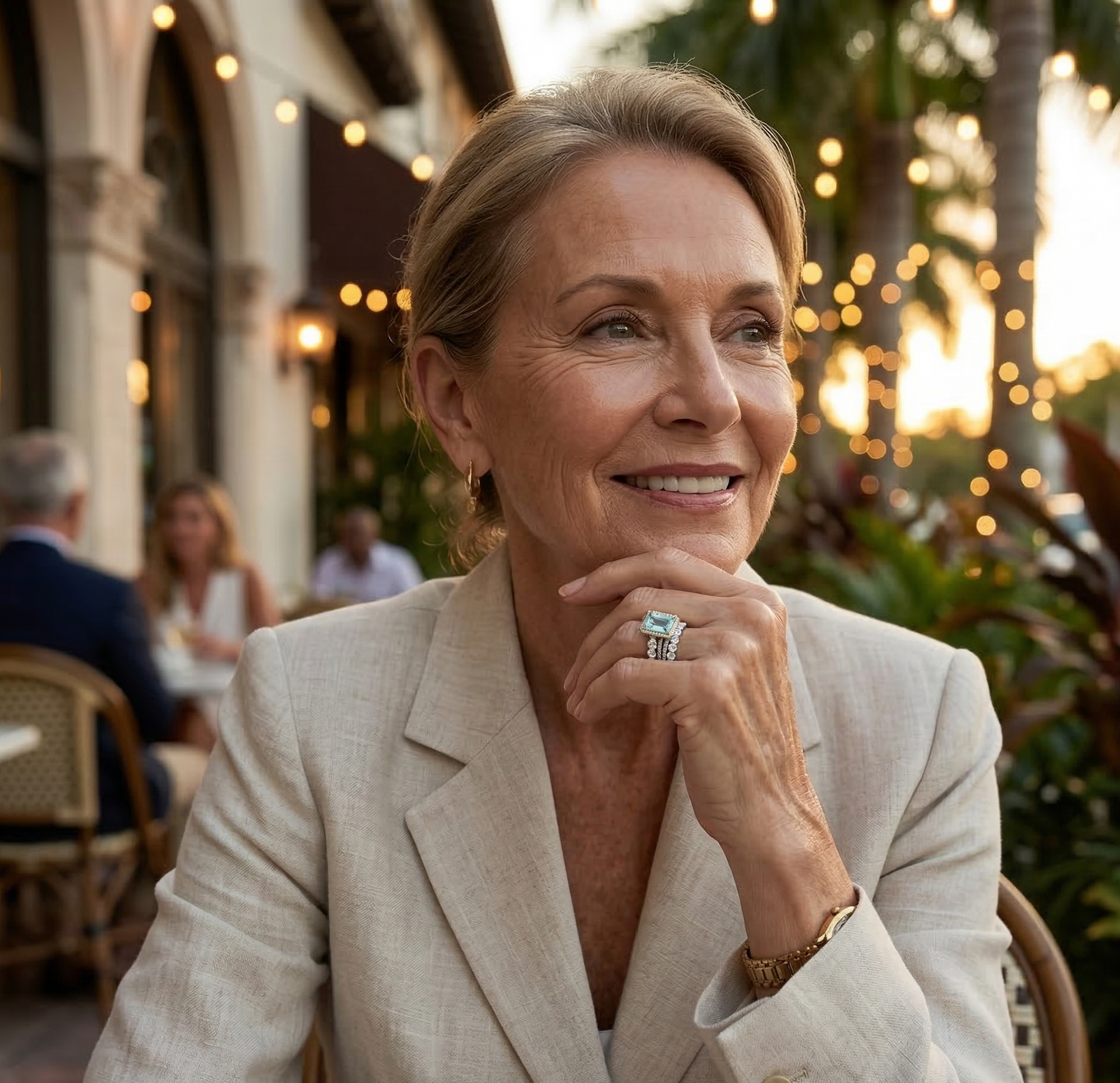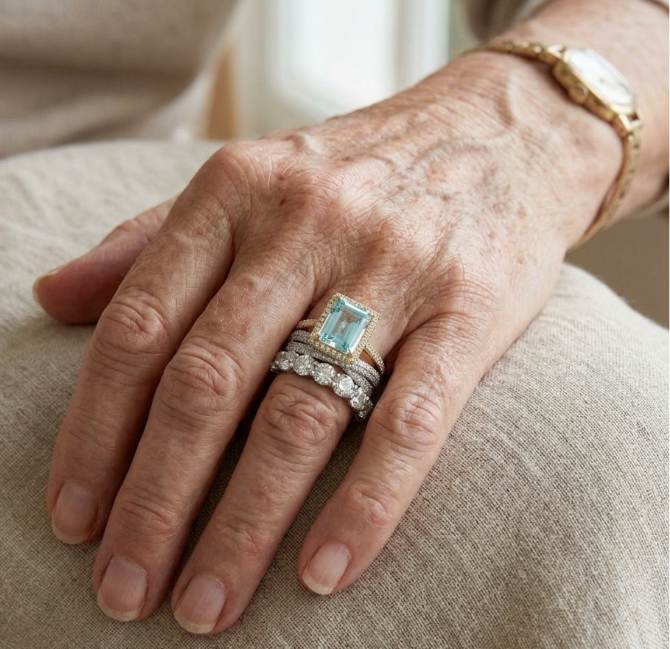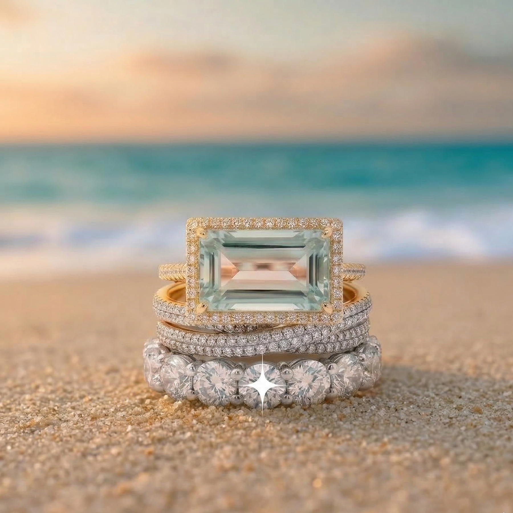 Conjunto de anillos vintage turquesa elegante y sofisticado que destaca por su brillo y diseño refinado. En la parte superior se observa un anillo con una piedra rectangular de tono turquesa, cuidadosamente enmarcada por una fila de pequeñas piedras brillantes que realzan su luminosidad. Debajo, varias bandas delgadas decoradas con diminutas piedras crean un efecto de capas que aporta textura y estilo. En la base, otro anillo con piedras redondas de mayor tamaño añade un toque clásico y llamativo. La combinación de formas y destellos crea una composición armoniosa, perfecta para un look elegante y moderno.