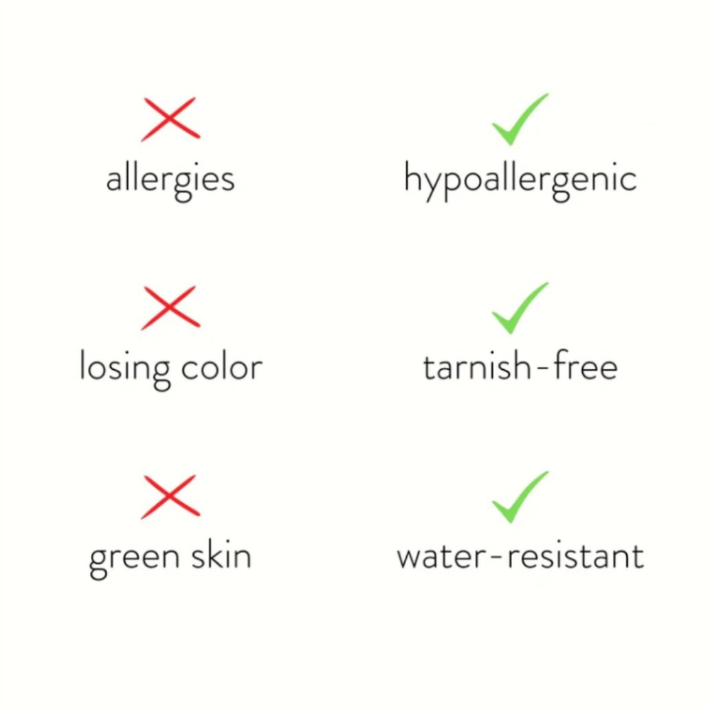 Hecho de acero inoxidable resistente al agua, nunca más tendrá que preocuparse por joyas descoloridas o empañadas.